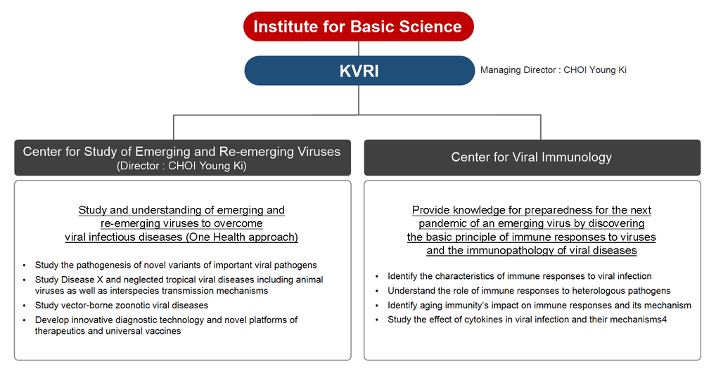 The Korea Virus Research Institute (KVRI) was launched under the Institute for Basic Science (IBS) in July 2021. The KVRI comprises two research centers and CI groups. The Center for Study of Emerging and Re-emerging Viruses and the Center for Viral Immunology are the main centers.